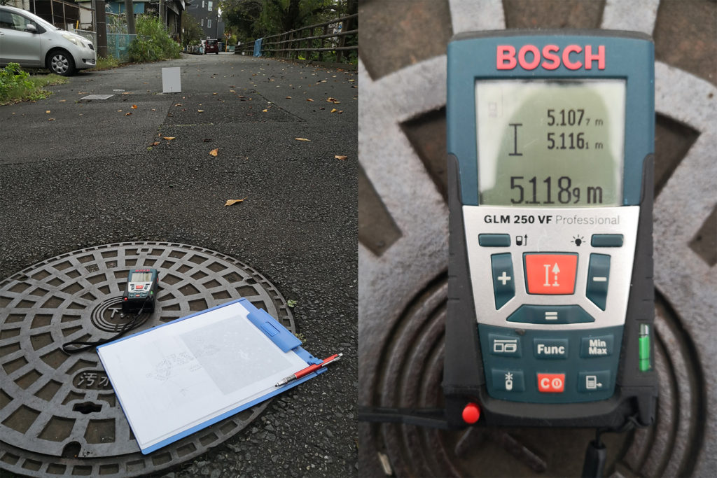 マンホール中心x2・鋲・中心杭x2・市基準点・マンホール穴・縁石角部分の、合計で8点を測りました。(距離は全て斜距離になります)