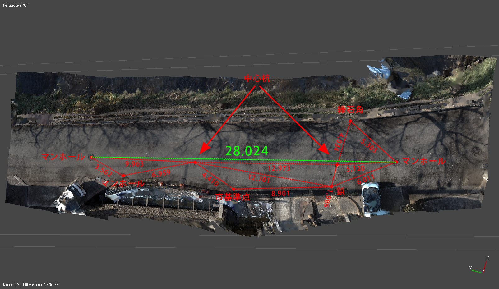 Metashapeで3Dモデル化を行い、マンホール中心や鋲、杭の距離をレーザー距離計で測定して、実測値とモデル上の距離を比較して検証してみます。